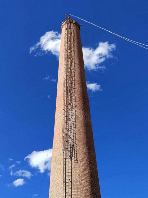 第一點,估算煙囪參數,煙囪拆除如果有準確的數據可以忽略,沒有準確數據的朋友需要估算煙囪高度、煙囪下口徑。煙囪高度采用爬梯數量及爬梯間隔高度獲取,例如每個爬梯50cm,共80個,可以粗略估算煙囪高度43米左右??趶娇梢灾苯訙y量。