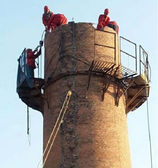 2、地面設(shè)安全警戒線,施工人員安全通道及場地清理。在煙囪底部外壁向外直徑20米范圍內(nèi)做好防護警戒線,通往煙囪爬梯的過道搭好施工人員的安全通道,周圍區(qū)域設(shè)置專人看護,同時地面人員整理路地及機械設(shè)備安置整理。