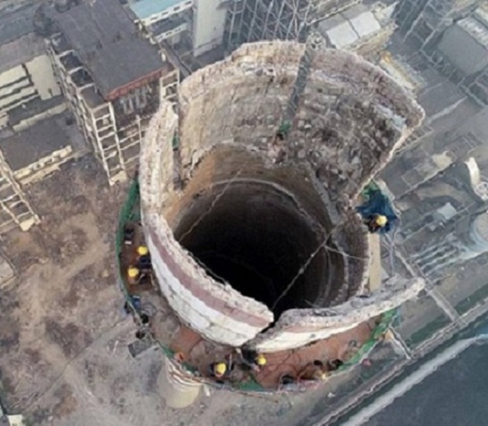 我們常見的,電視上,視頻上看的比較多的,就是爆破拆除了,用雷管把煙囪炸塌。當然里面有很多細節(jié),比如是定向拆除還是原地破碎等等就不介紹了。