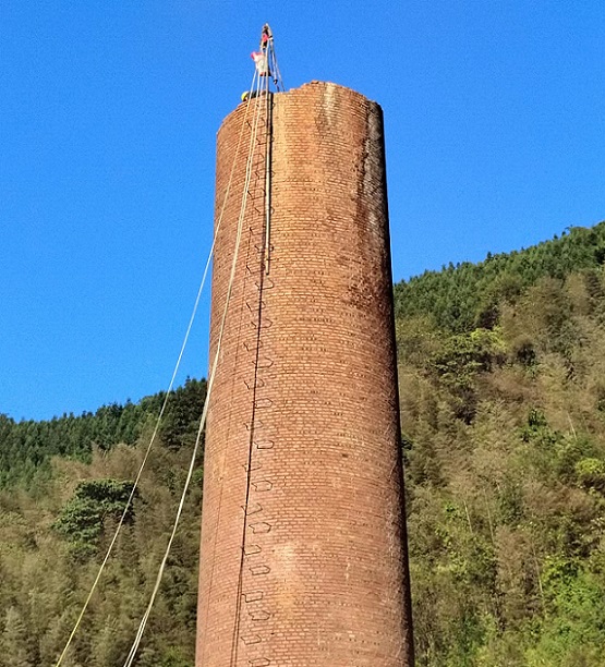 磚煙囪,國(guó)標(biāo)圖集中最高的磚煙囪,拆除難度大。此次拆除的磚煙囪沒(méi)有場(chǎng)地,只能人工拆除,雖然進(jìn)度慢,但是確保了施工安全。