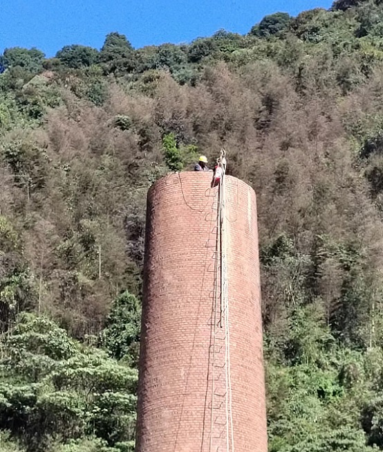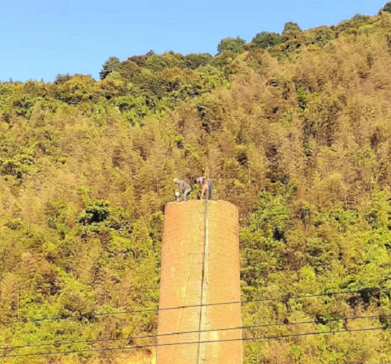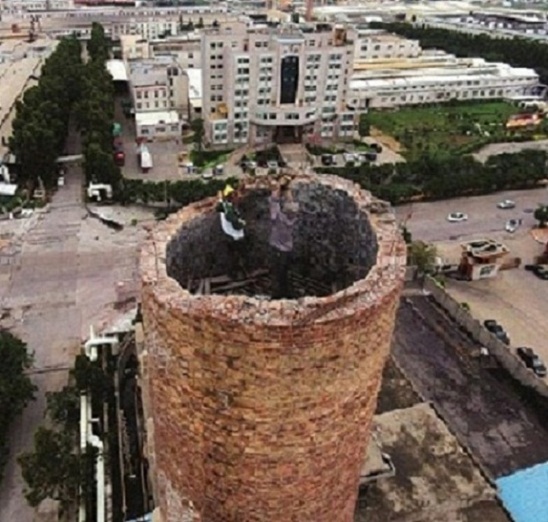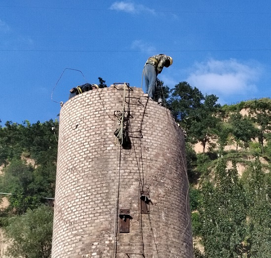 在煙囪頂口上橫放一塊木板、兩頭伸出煙囪各30公分以上,由于煙囪頂口和底部有誤差所有要以將誤差計算在內(nèi)。施工人員帶好保險帶、站在木板與煙囪墻壁上進行施工,用電鎬手錘進行拆除,拆除下來舊磚由煙囪外面掉下來,或者走煙道內(nèi)部清理。