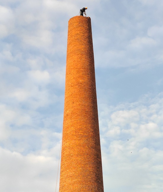 在煙囪頂口上橫放一塊木板、兩頭伸出煙囪各30公分以上,由于煙囪頂口和底部有誤差所有要以將誤差計(jì)算在內(nèi)。施工人員帶好保險(xiǎn)帶、站在木板與煙囪墻壁上進(jìn)行施工,用電鎬手錘進(jìn)行拆除,拆除下來舊磚由煙囪外面掉下來,或者走煙道內(nèi)部清理。