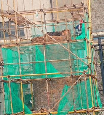 鍋爐都拆了,煙囪矗立在這里都好幾年沒冒煙了,現(xiàn)在煙囪拆除可與周邊小區(qū)美化相協(xié)調(diào),環(huán)境肯定能改善,多好??!”住在經(jīng)三緯九鍋爐房附近的居民徐女士說(shuō)。7日,該處鍋爐廠房?jī)?nèi)45米高的磚煙囪已被綠色的防護(hù)網(wǎng)嚴(yán)密的包裹起來(lái),工作人員正在緊張忙碌地進(jìn)行著拆除作業(yè)?!盀榉乐故┕て陂g碎石、碎磚墜落砸傷過(guò)往行人,我們做了嚴(yán)密的防護(hù)措施,加了腳手架,腳手架內(nèi)外又加了嚴(yán)密的防護(hù)網(wǎng),拆除作業(yè)周邊派專門的安全員提醒行人和車輛注意安全。