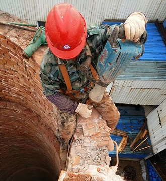 9、拆除工具使用電鎬、大錘、鑿子等工具,二人一組配合,以此類推往下拆除磚煙囪。