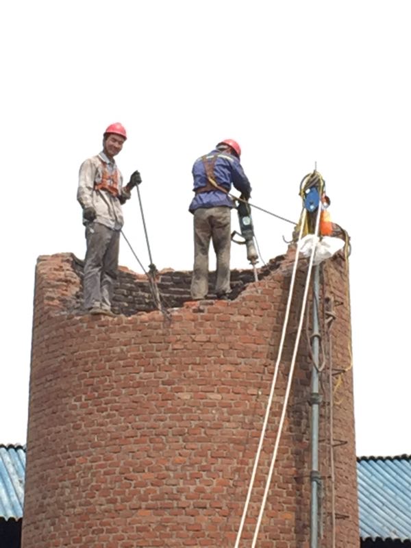 (1)煙囪正常完好,施工人員從煙囪外壁的鋼爬梯上進(jìn)行登攀到煙囪頂部(第1次攀登煙囪鋼爬梯時(shí)、首先帶好安全保險(xiǎn)帶、每個(gè)煙囪鋼爬梯都要進(jìn)行試?yán)蛽u動(dòng)、確保煙囪鋼爬梯的承受力),施工人員把保險(xiǎn)帶牢固的栓在煙囪鋼爬梯上(栓保險(xiǎn)帶時(shí)、必須要栓2-3個(gè)牢固鋼爬梯上),保險(xiǎn)帶確保牢固后,施工人員在煙囪頂部進(jìn)行人工拆除煙囪。