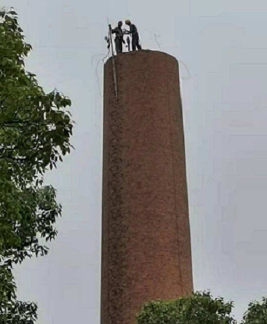 通過高空攀爬爬到煙囪頂部,用拆除工具組裝大錘和千斤頂進行簡化拆除,拆除的磚塊應落在煙囪內部(或外壁)。拆除煙囪時,煙囪底部應采取保護措施防止殘磚或廢料在高空被拆除。具體來說應該在煙囪上搭建一個防護平臺,讓不小心殘留的磚塊或垃圾落在平臺上從而達到正確拆除的目的,同時拆除煙囪工人應找可靠的位置系好防護帶并保管好自己的施工工具。